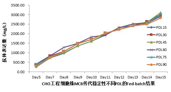 - ● 通過優(yōu)化基礎(chǔ)培養(yǎng)基和補料培養(yǎng)基成份,高密度細(xì)胞培養(yǎng)(200L一次性反應(yīng)器)的抗體表達量可達到2-5g/L,批產(chǎn)量可達到300-800g,MCB/WCB 90 PDL傳代穩(wěn)定。